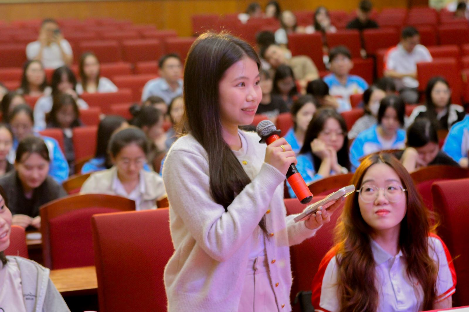 Bên cạnh đó, phần trao đổi, thảo luận trực tiếp giữa sinh viên và doanh nghiệp đã diễn ra sôi nổi, tập trung vào các nội dung thiết thực như yêu cầu về năng lực, kỹ năng cần thiết, cơ hội thăng tiến và những thách thức trong giai đoạn đầu sự nghiệp. Qua đó, sinh viên có thêm góc nhìn toàn diện, thực tế hơn để định hướng con đường nghề nghiệp phù hợp với năng lực và mục tiêu cá nhân.