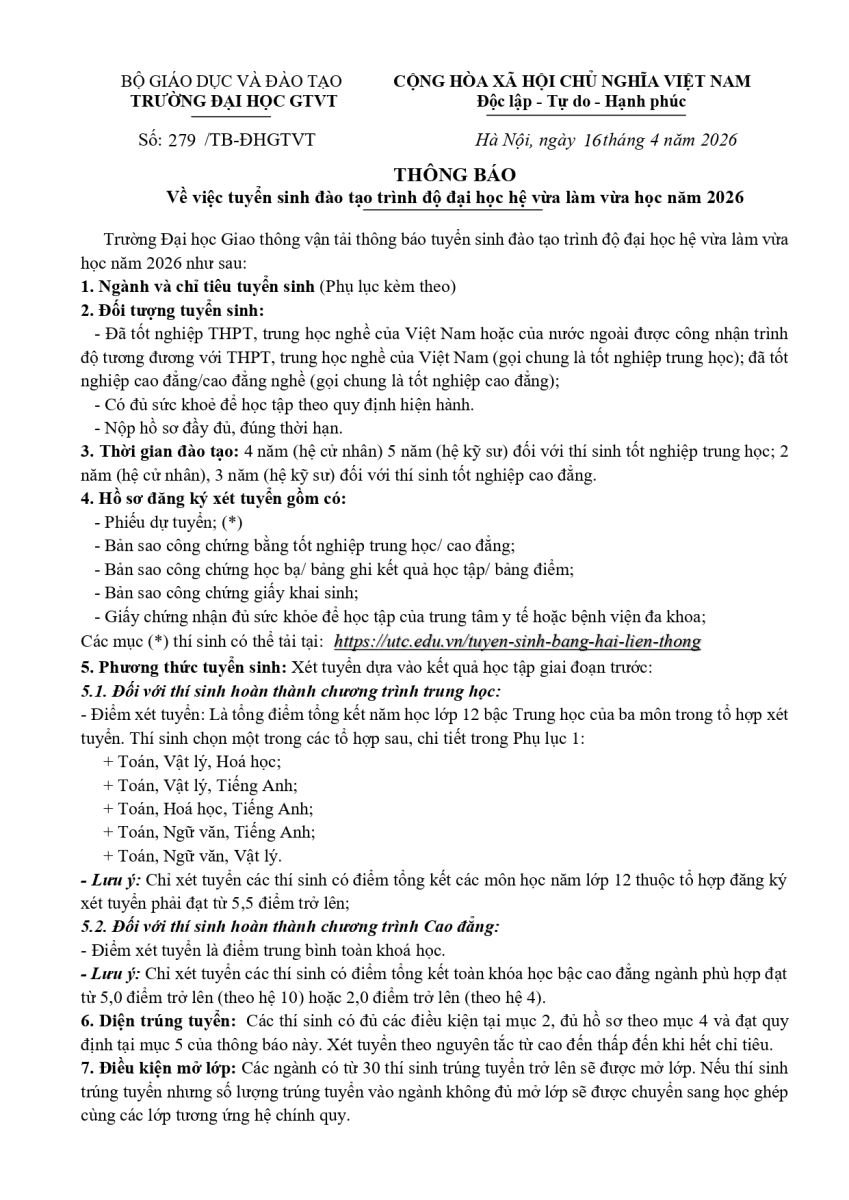 THÔNG BÁO Tuyển sinh đào tạo trình độ đại học hệ vừa làm vừa học năm 2026 Đính kèm: Phiếu TS VLVH 2026.docx Đăng bởi: Phòng Khảo thí & ĐBCLĐT