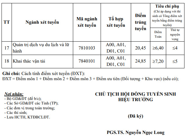Trường Đại học Giao thông vận tải thông báo điểm chuẩn xét tuyển bằng kết quả thi tốt nghiệp THPT năm 2021. Sau khi biết kết quả trúng tuyển, thí sinh sẽ đăng ký nhập học online theo thông báo từ ngày 16/9/2021 đến 17h00 ngày 26/9/2021.