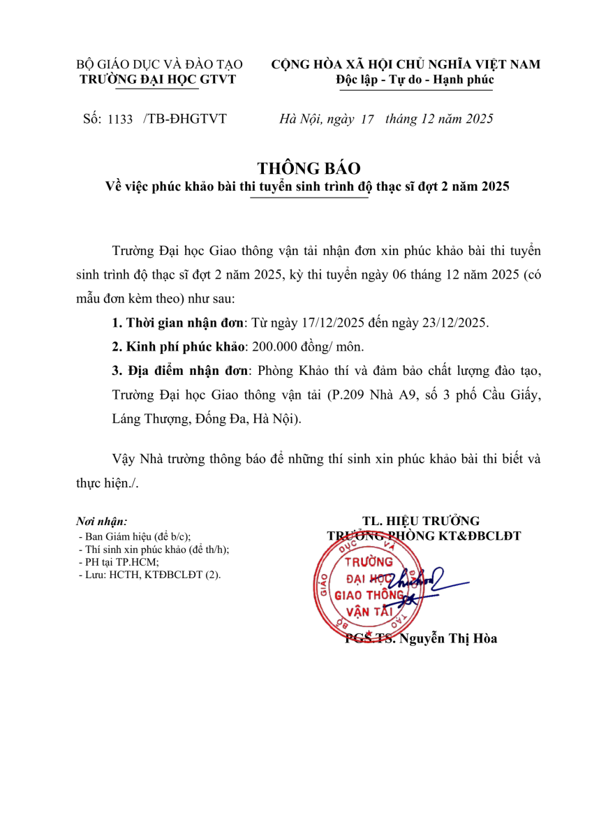 THÔNG BÁO PHÚC KHẢO BÀI THI TUYỂN SINH TRÌNH ĐỘTHẠC SĨ ĐỢT 2 NĂM 2025 Đính kèm: TB Phúc khảo.1133.pdf Đăng bởi: Phòng Khảo thí & ĐBCLĐT