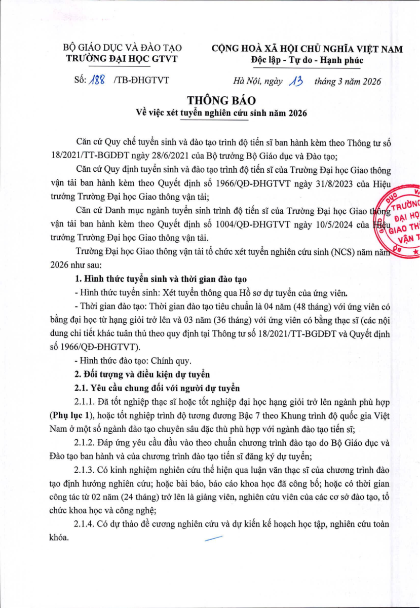 THÔNG BÁO XÉT TUYỂN NGHIÊN CỨU SINH NĂM 2026 Đính kèm: TB 188 tuyển NCS 2026.pdf Hồ sơ.docx Đăng bởi: Phòng Khảo thí & ĐBCLĐT
