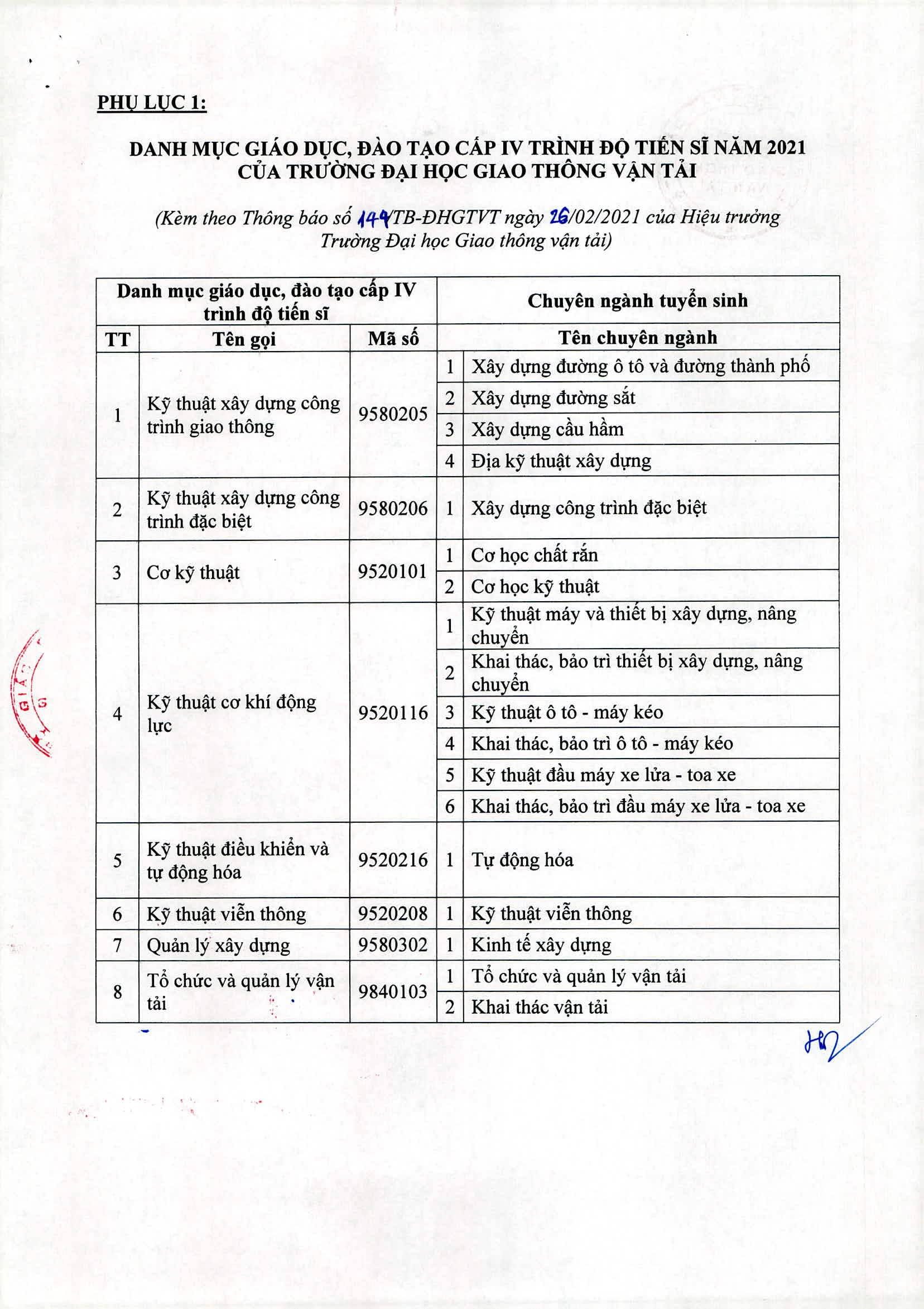 Thông báo xét tuyển nghiên cứu sinh năm 2021 Đính kèm: kinh phí.pdf 94271_144.pdf LLKH.doc PDT+ Đơn.docx Đăng bởi: Trường Đại học Giao thông vận tải